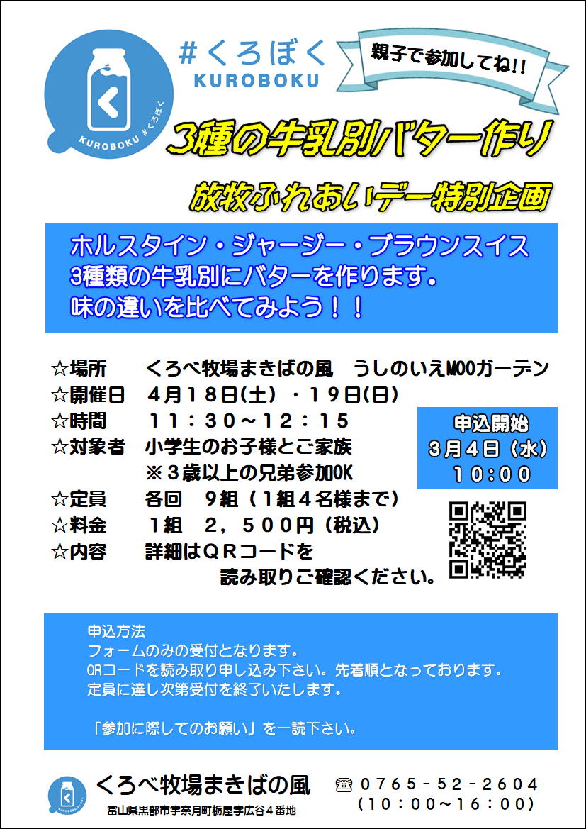 「3種類の牛乳別バター作り」体験を実施いたします。